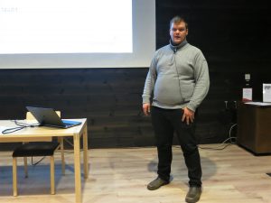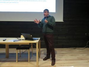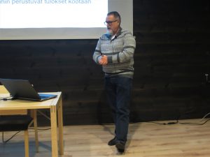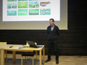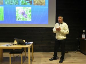 Markku Tammi kertoi luomusiementuottajan puheenvuorossa monia mielenkiintoisia asioita siementuotannon käytännöistä. Tilan pito on aloitettu vuosikymmeniä sitten osa-aikaisena viljelynä. Menneistä ajoista tila on kasvanut huomattaviin mittoihin ja oleellisena osana tuotantoa on nykyisin myös tilan 78 000 broileria. Esillä oli mm. tilan käyttämä viljelykierto ja nurmien lopetuskäytäntö. Tärkeä viesti kuulijoille oli tuotannon ja viljelykierron huolellinen suunnittelu vuosiksi eteenpäin.