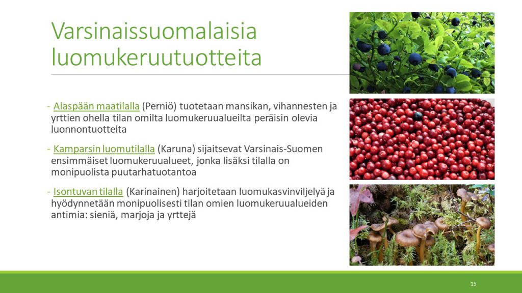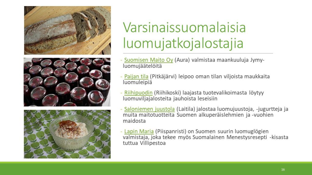 Julkaisun loppupuolelle on koottu esimerkkejä varsinaissuomalaisista luomuyrityksistä. Yrityksen nimen klikkaus vie suoraan kyseisen yrityksen verkkosivuille.